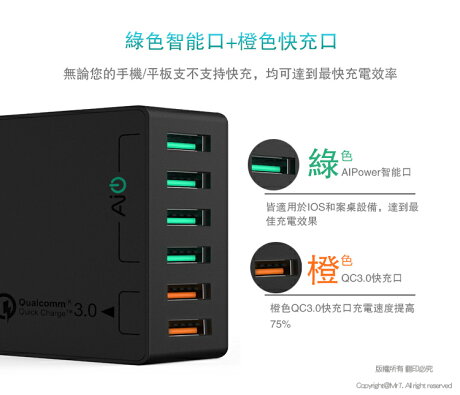 Aukey 60w 6孔充電器qc3 0 快速快充急速出國必備多孔變壓器可同時對iphone Ipad 行動電源多裝置同時充電qc2 0 Usb A 贈micro Usb線 Pa T11 Rest3c補給站